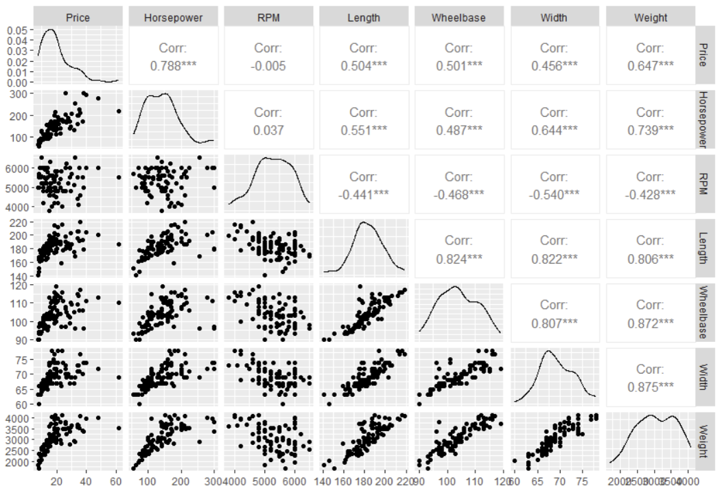 data1=data[c('Price','Horsepower','RPM','Length','Wheelbase','Width','Weight')]